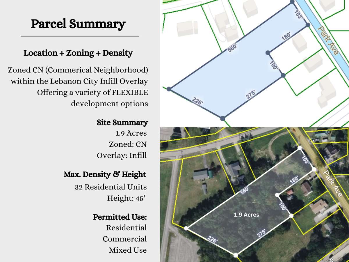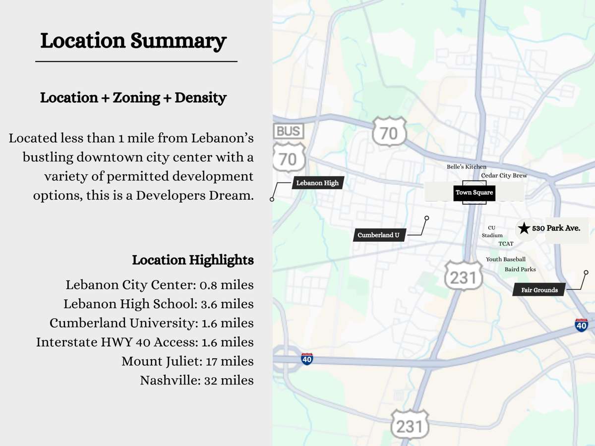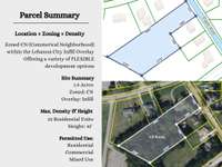 Attention Builders, Developers and Investors! This prime 1. 93 acre parcel offers Location + Zoning + Density. Located just blocks from Lebanon' s bustling Town Square AND zoned CN ( Commercial Neighborhood) within the city' s Residential Infill Overlay District. Flexible CN zoning permits a wide range of development options, including Residential and Commercial Mixed Use. Max density permits up to 32 residential units. Adjacent to Vanderbilt’s Wilson County Hospital McFarland campus, Cumberland U Rudy School of Nursing and the TCAT campus. Just minutes from Lebanon High, the Wilson County fair grounds and HWY 40 interstate access. This is an intriguing Investor/ Developer opportunity. Boundary survey available upon request. Additional parcels may be available for larger tract.